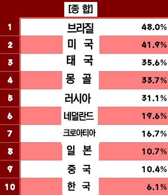 이외에 몽골(33.7%)과 러시아(31.1%)가 각각 4위와 5위를 차지했으며 순위권 안에 포함된 아시아권 나라로는 일본(10.7%)·중국(10.4%)·한국(6.1%)이 있었다.