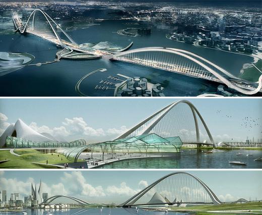 두바이크릭 강을 가로지르게 될 이 다리는 뉴욕 건축회사 ‘FXFOLE’에서 디자인 한 것. 총길이 1.7Kmㆍ높이 205m의 거대함을 자랑하는 이 다리는 한시간에 차량 2만대가 통과할 수 있는 왕복 12개 차선과 도시철도가 놓여질 예정이다.