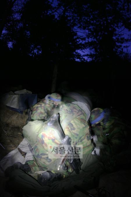 ‘병사들의 어머니’인 고수혁 행정보급관이 기자의 텐트를 찾았다. “오늘은 어제보다 더 추워 새벽 기온이 영하 20도까지 떨어질 것이니 단단히 준비해 자라.”면서 발이 닿을 침낭 아래 쪽에 핫팩을 두 개를 넣어두면 견딜만 할 것이라고 조언해 줬다.
