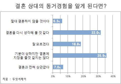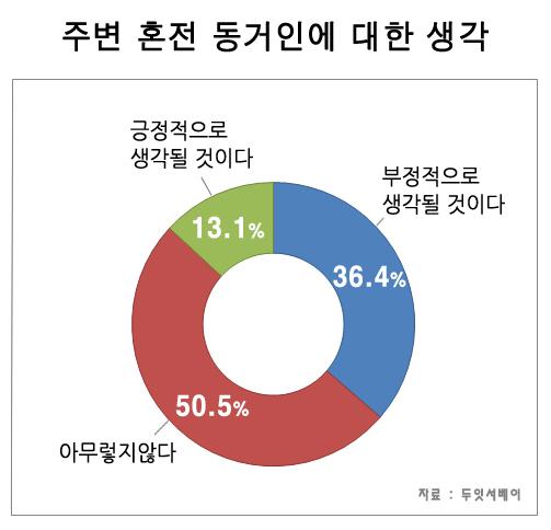 온라인 설문조사 기업 두잇서베이가 지난 10일부터 7일간 인터넷과 모바일 두잇서베이 앱 사용자 4553명을 대상으로 ‘혼전 동거에 관한 인식도’를 조사한 결과, 찬성과 반대 응답자가 각각 37%로 비슷한 수준으로 조사 됐다.