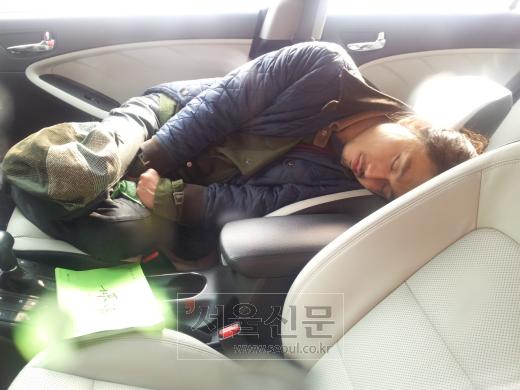 ※사진 설명-오정세가 서울신문 나우뉴스에 단독 제공한 위 사진은 ‘보고싶다’ 촬영 중 ‘차 안에서 잠든 주형사’ 씬을 촬영하다 실제로 잠든 그의 모습을 담고 있다. 그는 “연기중인 주형사. 실제 아님!” 이라고 설명했지만 이를 촬영한 매니저는 “잠든 것이 분명하다.”고 강력하게 주장했음을 밝힌다.