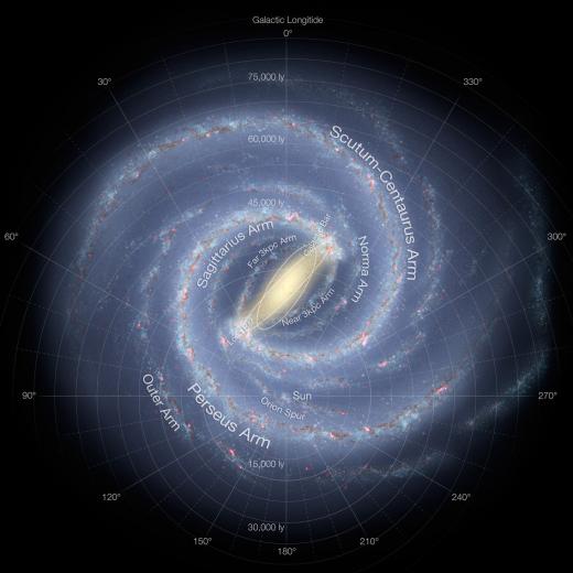특히 이 지도는 지구에서 약 2만 7000광년 거리에 있으며 고밀도 가스와 먼지 구름 때문에 가려진 은하 중심인 팽대부의 모습을 상세히 재현하고 있다. 이는 이를 투과할 수 있는 적외선 복사와 같이 장파장을 통해 관측하는 것이다.