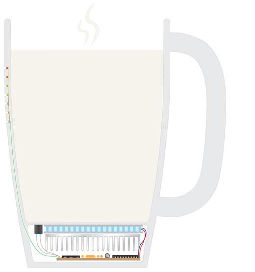 이 머그잔에 차나 커피 등의 뜨거운 음료를 넣으면 내부에 장착된 열선이 현재 온도를 측정해 디지털 램프를 점등한다. 여기에는 온도 차를 이용해 발전하는 열전 모듈을 사용해 배터리나 전원 케이블을 사용해야 하는 불편함도 없다.