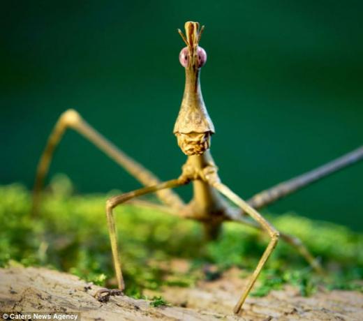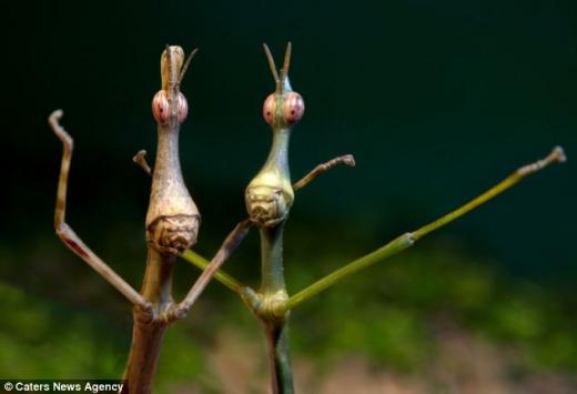 어찌보면 나뭇가지처럼 생긴 이 곤충들은 국내에 말머리 방아깨비(학명: Pseudoproscopia latirostris)로 소개된 바 있다. 이름대로 머리는 말과 비슷하지만 그 모습은 ‘외계인’이 어깨동무를 하는 듯 보인다. 이 곤충은 그 재미난 모습에 세계 여러 나라에서 애완 동물로도 키워지고 있다.