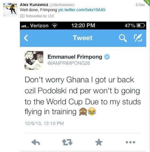 “가나 대표팀 걱정마, 외질 포돌스키 메르테사커는 월드컵에 못 나갈거야. 내 스터드가 훈련 중에 날라다닐 테니까” (삭제된 프림퐁 공식트위터 트윗 내용)