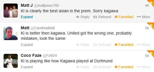 두번째 사진=기성용과 카가와를 비교하고 있는 현지팬들(트위터)