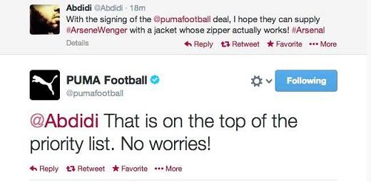 파트너쉽이 공식적으로 발표된 이후, 축구 팬들은 푸마 공식계정에 많은 메시지를 보냈고, 푸마도 이에 일일이 답하며 아스널과의 새 계약에 큰 정성을 보였다. 그 중, 한 팬이 “벵거 감독에게 제대로 작동하는 지퍼가 달린 자켓을 공급해주길 바란다”는 메시지를 보냈고, 이에 푸마는 “그것은 우리의 최우선순위다. 걱정 마라”고 응답하며 팬들의 호응을 샀다.