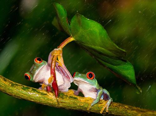 과거에도 나뭇잎을 들고 비를 피하는듯한 개구리의 모습이 사진으로 포착된 바 있으나 이렇게 두 마리가 촬영된 것은 극히 드물다.