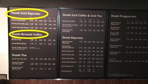 현지시간으로 지난 7일 미국 로스앤젤레스에 등장한 ‘멍청이 스타벅스’는 모든 커피 메뉴 앞에 ‘덤’(Dumb) 단어가 포함돼 있으며, 스타벅스에서 자주 들을 수 있는 노라 존스 등의 가수 음반에도 ‘덤’이라는 단어가 붙어있다.