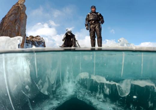우크라이나 사진작가 안드레이 네크라소브(42)는 호수의 얼음 표면 주변을 유영하며 한 시간 동안 호수 속 곳곳 및 호수에서 바라본 바깥풍경을 카메라에 담았다.
