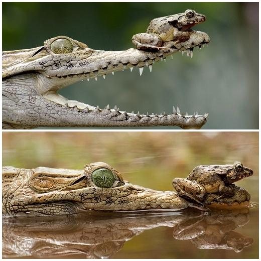 입을 쫙 벌리고 유유히 헤엄을 치는 악어와 그 위에서 태평한 표정을 짓고 있는 개구리의 모습은 새삼 동물 생태계 먹이 사슬구조에 혁명이 온 것은 아닌지 의심을 자아낸다. 하지만 현실은 이렇게 낭만적이지 않다. 이 악어는 하마, 코끼리도 무차별 공격하는 무서운 크로커다일과로 좀 전에 다른 개구리 한 마리를 이미 소화시킨 후다.