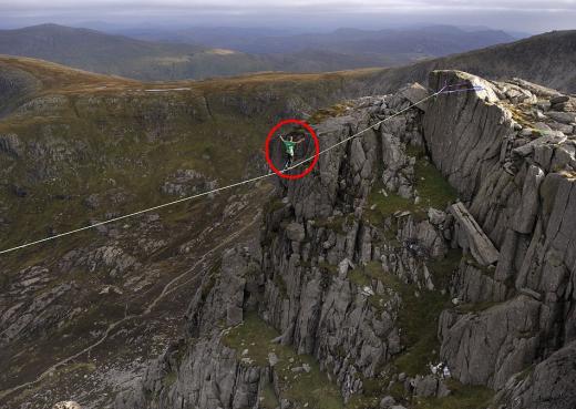 안전로프가 있긴 하지만 단지 줄 하나에 모든 것을 의지할 수는 없는 법, 개인의 균형감각과 담력이 극대화되지 않으면 목숨이 위험해지는 순간이었다. 세 사람은 총 2시간에 걸쳐 차례로 차분하게 로프 위를 걸어 반대편 계곡으로 이동하는데 성공했는데 이는 ‘영국 신기록’이었다.