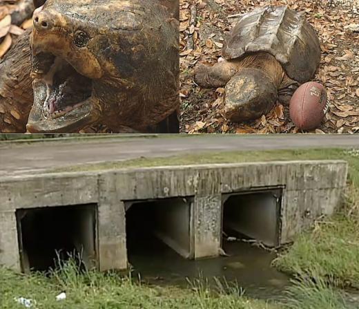 머리 크기만 미식축구공만한 이 악어거북의 몸길이는 4피트(약 1.2m) 정도. 이 악어거북은 커다란 몸집에도 불구하고 무리하게 배수로를 지나려다 몸이 끼인 것으로 알려졌다.