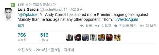 사진설명 2. 앤디 캐롤이 맨시티를 상대로 최다득점을 기록했다는 통계자료를 리트윗하고 나선 전 리버풀 스타 선수 루이스 가르시아(루이스 가르시아 트위터)