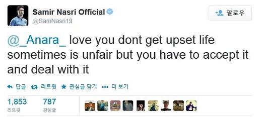 불과 몇시간 후 나스리가 직접 해당 트윗에 답글을 달아 눈길을 끈다. 나스리는 “사랑해 속상해하지 마”라며 “인생은 때로는 불공평하지만 받아들이고 나아가야해”라는 메시지를 남겼다.