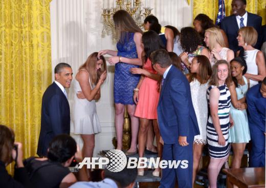 AFP통신 등 외신에 따르면 9일(현지시간) 미국 백악관에서 열린 NCAA(미국대학스포츠협회) 농구 챔피언십 남녀 우승팀인 코네티컷대학을 축하하기 위한 초청회에서 스타선수 스테파니 돌슨(22, 196cm)이 기념촬영 도중 중심을 잃고 단상 밑으로 내려섰다.