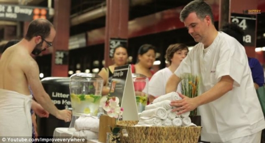 영국 일간 데일리메일 6일 자 보도에 따르면 플리시몹 집단 ‘임프로브 에브리웨어’(Improve Everywhere)가 뉴욕의 한 지하철역에서 ‘서브웨이 스파’를 임시(?) 개장했다.