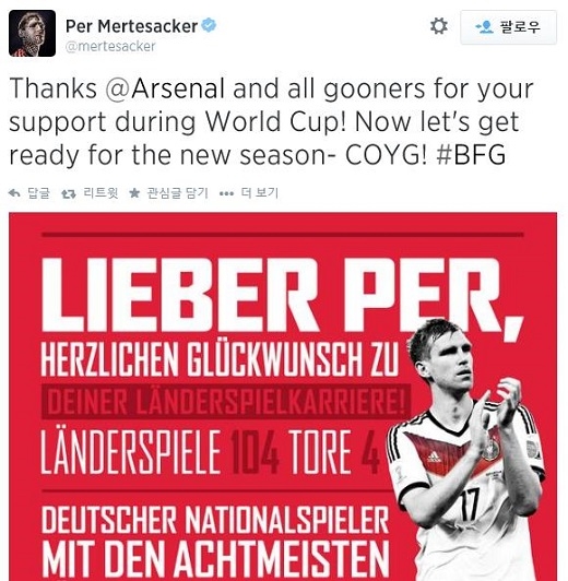 그에 이어 메르테자커는 또 다른 트윗을 통해 “월드컵 기간 중 보내준 아스널 팬들의 응원에 감사하다”며 “이제 새 시즌을 준비하자”는 메시지를 남겼다. 아스널 팬들이 자기에게 붙여준 애칭인 ‘BFG(Big F***ing German)’을 스스로 사용하며 팬들과 서슴없이 의사소통하는 모습도 빼놓지 않았다.