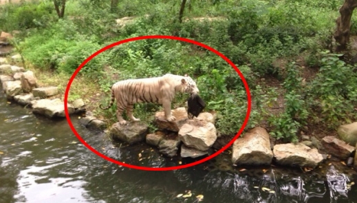 당시 목격자들은 이 호랑이가 매우 재미있는 장난감을 발견한 듯 빠르게 헤엄쳐 와 가방을 낚아채 갔다고 전했다.