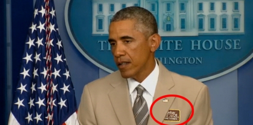 사진=위에서부터 카키색 정장을 입고 기자회견을 하고 있는 오바마 대통령(백악관 공개영상 캡처), 오바마 정장에 회사 로고(붉은 색 원 안)를 붙여 세일즈맨으로 비난한 사진 (트위터 캡처)