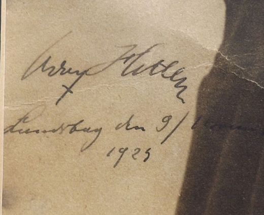 단정한 양복차림으로 정면을 응시하고 있는 히틀러의 상반신이 담긴 해당 사진 구석에는 ‘아돌프 히틀러’라는 친필서명과 함께 ‘란츠베르크(Landsberg) 1925’라는 문구가 적혀있다. 이는 무엇을 의미하는 것일까?