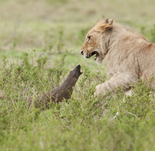 30~40㎝크기의 자그마한 몽구스가 본인 몸보다 훨씬 거대한 어린 사자 4마리와 대치하고 있다. 언뜻 보면, 몽구스가 전혀 상대가 될 수 없는 최약체로 보이지만 사실은 그렇지 않다. 이 몽구스는 사자 4마리를 상대로 전혀 물러섬 없이 악을 쓰며 대치하고 있다.