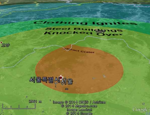 소행성은 중간 크기로 분류되는 축구장의 3배에 달하는 약 329m. 중간 규모의 소행성이지만 그 결과는 놀라웠다. 서울 전역에 거대한 크레이터가 생기는 것은 물론 중심부 빌딩도 무너지는 큰 피해를 당하는 것으로 나타났다. 또한 경기권 전역까지 1도 화상 수준의 피해를 입는 것으로 드러나 인명 손실은 예측 조차 하기도 힘든 수준.