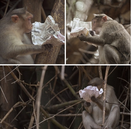 인도 카르나타카 주(州) 뱅갈루루 도심 남쪽에 위치한 국립 식물원 랄박 보태니컬 파크 (Lalbagh Botanical Garden)에 살고 있는 레서스원숭이(Rhesus monkey) 한 마리가 매우 심각한 표정으로 신문 종잇장을 살피고 있다.