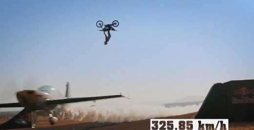 이 놀라운 묘기는 세계적인 오토바이 곡예 전문가 닉 데 비트(Nick De Wit)와 베테랑 파일럿 글렌 델(Glen Dell)이 약 2년에 걸쳐 준비한 퍼포먼스다. 작년 9월, 남아프리카 공화국 북서부 총림(叢林) 지대에서 진행된 이 아슬아슬한 스턴트는 아무런 사고 없이 무사히 종료됐고 세계에서 다시 찾아보기 어려운 절정의 묘기 영상을 남겼다.