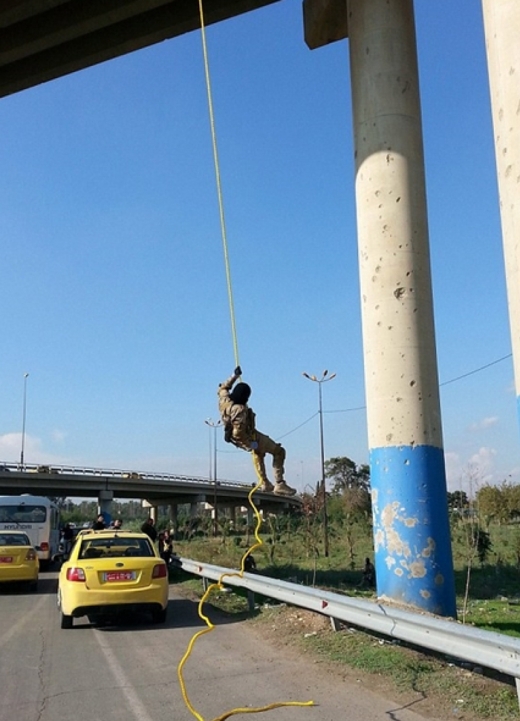 영국 일간지 데일리메일은 이라크 제2도시 모술의 한 고속도로 다리에서 공중 레펠 훈련을 받고 있는 IS대원 십여 명의 희귀 사진을 3일(현지시간) 공개했다.
