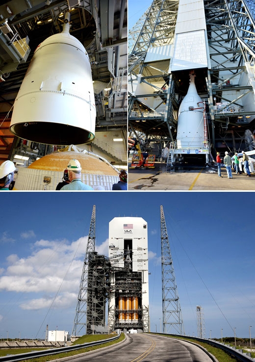 오리온은 지난 10일 밤 플로리다주(州) 케네디 우주센터에서 발사 시설이 있는 케이프커내버럴 공군기지로 이송된 채 시험비행 날만 기다리고 있다.