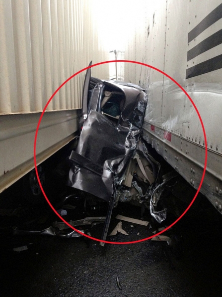빙판길에 미끄러지면서 자신이 타고 있던 차가 두 트럭 사이에 끼어 완전히 파손되었으나 운전자는 기적처럼 거의 다치지 않은 사고 당시의 현장 사진이 공개되어 화제가 되고 있다고 미 현지 언론들이 18일(현지 시간) 보도했다.