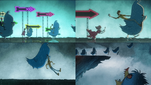주위를 둘러보면 남성과 마찬가지로 트위터에 중독된 사람들이 저마다 파랑새 등에 올라탄 채 화살표 방향에 이끌려 간다. 그때 남성을 쫓아냈던 여성이 다시 한 번 기회를 주려는 듯 쫓아왔다. 두 사람은 열심히 손을 뻗어보지만 여성은 그만 넘어지고 만다. 망연자실하는 남성을 본 파랑새가 이제는 그의 목덜미를 물고 날아오른다. 절벽 바깥쪽까지 날아간 뒤 남성을 내던져 버리는 것이다.