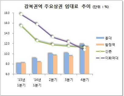 부동산114에 따르면 지난 해 4분기 홍대역상권의 임대료는 13년보다 무려 46.5% 올랐으며 합정역상권도 39.3% 상승했다. 신촌상권과 이대상권의 임대료는 끝없는 추락을 이어가고 있다. 신촌상권과 이대상권은 각각 동기간 동안 27.4%, 39.1% 하락했다.