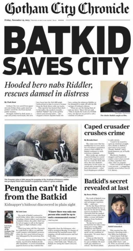 마치 동화같은 이 소식은 그해 미국 언론들이 뽑은 가장 따뜻한 뉴스로 선정된 실화다. 이 실화의 주인공은 지금은 6살이 된 마일스 스코트. 백혈병을 앓고 있었던 소년은 자신이 가장 좋아하는 영웅 배트맨이 되고 싶어했고 이같은 바람이 한 재단의 도움으로 실현된 것이다.