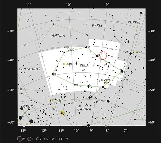 봄철 남쪽하늘에 보이는 별자리인 돛자리(Vela) 부근에 위치한 RCW 34은 지구에서 약 2만 2000년 광년 떨어진 곳에서 '스타 탄생'을 중이다. 천문학자들이 '샴페인 파티' 라 부르는 이유는 바로 찬란하게 빛나는 붉은색 가스의 향연 때문.