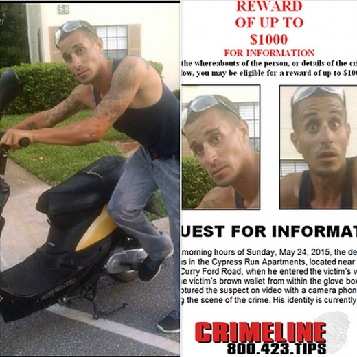 미국 플로리다주(州) 오렌지 카운티 경찰국이 지난달 28일 경찰국 공식 페이스북에 공개 수배한 이 절도범은 놀란 표정과 함께 급히 작은 스쿠터를 타고 절도 현장을 달아나는 장면 등의 사진이 게재됐다.