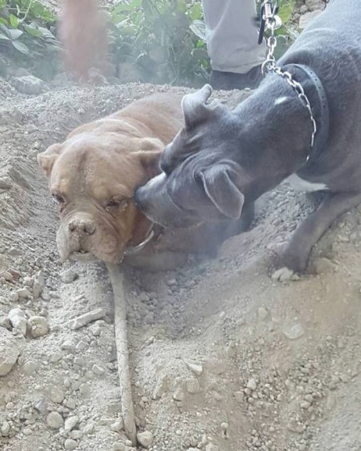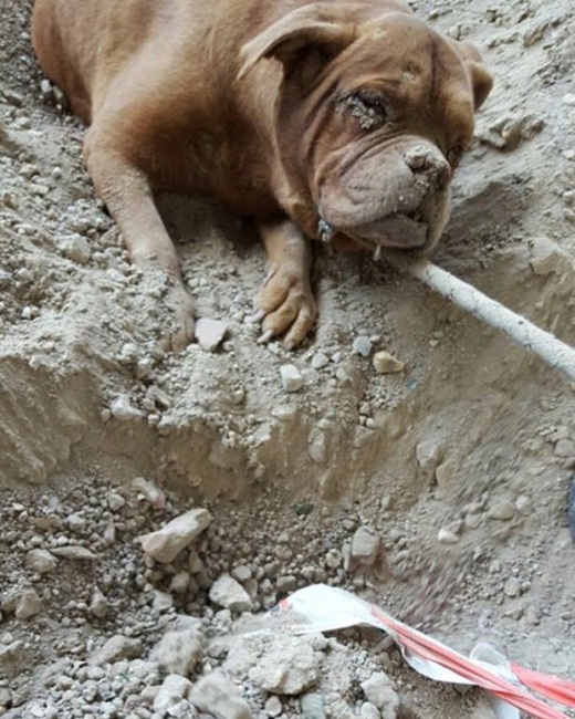 이 개는 거의 얼굴만 내민 채 흙과 돌에 파묻혀 있었으며, 도망을 가지 못하게 하려고 누군가가 목줄마저 단단하게 땅속에 파묻혀 놓았다.