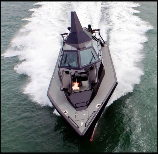 지금은 퇴역한 최초의 스텔스 공격기 F-117 나이트호크 특유의 각진 모습을 연상시키는 검고 매끈한 외관의 첨단 공격보트가 공개돼 눈길을 끌고 있다.