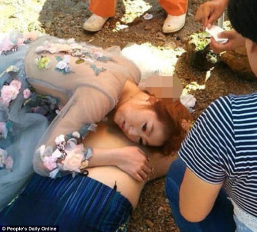 물에 빠져 의식을 잃은 남성을 구하고자 웨딩촬영 도중 달려와 심폐소생술을 실시한 중국 여성의 사진이 인터넷상에서 화제가 되고 있다.