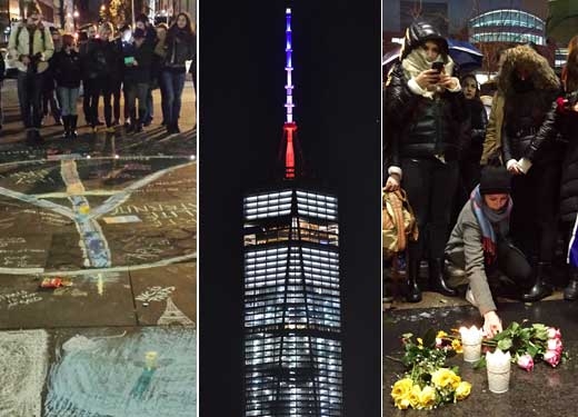 이날 미국 뉴욕 유니언 스퀘어(사진 좌측), 캐나다 몬트리올(사진 오른쪽)에는 수백여명의 시민들이 모여 테러로 희생된 사람들을 추모했으며 뉴욕의 원 월드 트레이드 센터는 프랑스의 국기색인 청·백·홍색의 불을 켜고 뜻을 함께 했다.