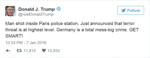 트럼프는 7일(현지시간) 아침 프랑스 파리에서 가짜 폭탄 조끼를 착용한 괴한이 경찰서에 침입하려다 사살된 사건에 대해 ‘파리 경찰서에서 남성이 사살됐다. 테러 위협이 최고조에 달했다는 발표가 뒤따랐다. 독일은 고강도 범죄로 엉망인 상태다. 부디 영리해지길 바란다’는 내용의 글을 트위터에 게재했다.