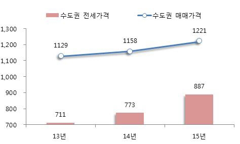 부동산114에 따르면 지난해 말 서울 및 수도권(이하 수도권)의 기존아파트 평균가격은 3.3㎡당 1220만원에 달했다. 지난 2014년, 평균 1158만원보다 5.4% 가량 오른 가격이다. 수도권 전세가격은 더욱 가파르게 오르고 있다. 지난 2014년보다 무려 14.7% 올라 3.3㎡당 887만원의 시세를 형성하기도 했다. 특히, 서울은 지난 해 10월 처음으로 전세가격이 3.3㎡당 1200만원선을 돌파하면서 서민들의 보금자리가 사라져 가고 있다.