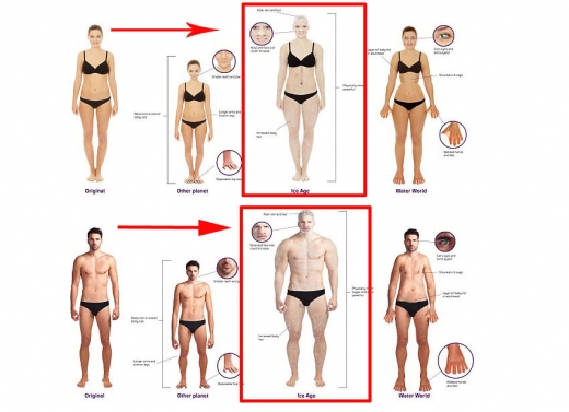 이중 빙하기가 찾아올 경우, 인류의 피부는 지금보다 훨씬 창백한 빛을 띨 가능성이 높은 것으로 예측됐다. 피부빛이 옅어지면 적은 양의 자외선만으로도 비타민D 합성이 쉬워지기 때문. 또 체온보호를 위해 체모와 근육이 현재보다 더 많아질 수 있으며, 차가운 공기로 둘러싸인 환경에서 더 많은 뜨거운 공기를 들이마시기 위해 코의 크기도 커질 것으로 내다봤다.