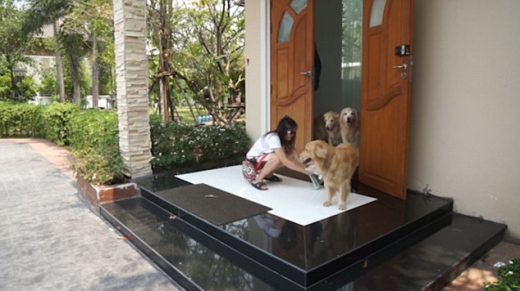 태국에서 촬영된 이 영상에는 현관문 앞에 골든 리트리버 네 마리가 줄을 서 있는 것을 볼 수 있다. 그런데 맨 앞에 서 있는 리트리버 반대편에 한 여성이 쪼그려 앉아 더러워진 개의 발을 수건으로 닦는다. 놀라운 점은 그 뒤로 나머지 리트리버 세 마리가 줄을 서 있다는 것.