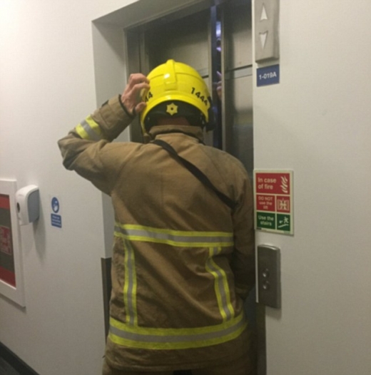 또 다른 사진은 구조대 복장을 한 소방대원이 엘리베이터 문을 열기 직전의 모습을 담고 있다.