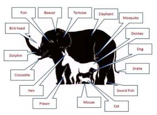 한 눈에 보이는 것은 코끼리와 당나귀, 개, 고양이 등 4마리 정도지만 놀라운 점은 무려 16마리의 동물 종이 숨어있다는 사실.