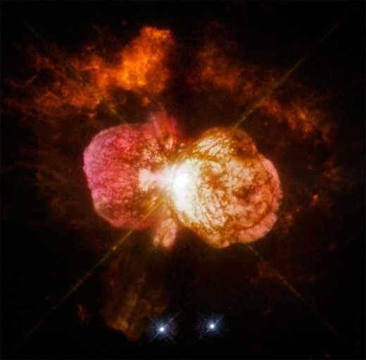 용골자리(Constellation Carina)에 위치한 에타 카리나이는 지금도 매우 격렬하면서도 불안정하게 활동하는 별로, 크고 작은 두개의 ‘태양’으로 이루어져 있다. 큰 별은 태양보다 질량이 90배 정도 크지만 무려 500만 배나 밝은 것이 특징이다. 작은 별 역시 태양보다 30배 정도 큰 질량을 가졌으며 100만 배는 더 밝다.