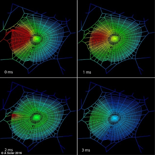그 결과, 거미줄 중심에서 기다리고 있는 거미가 실의 장력과 경도를 바꾸며 진폭도 조절하는 것으로 나타났다.