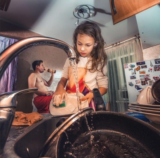 아마 당신은 잘 정돈되고 청결한 집안을 상상하겠지만, 사진을 보면 그야말로 가관이다. 집안은 난장판이고, 딸이 아빠 대신 요리와 설거지는 물론 다림질도 하고, 심지어 아빠를 목욕시키고 있는 것이다.